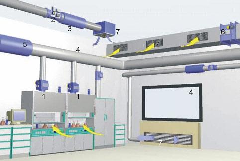 實(shí)驗(yàn)室通風(fēng)系統(tǒng)一般由通風(fēng)設(shè)備、通風(fēng)管道、消聲器、風(fēng)機(jī)、控制系統(tǒng)組成。