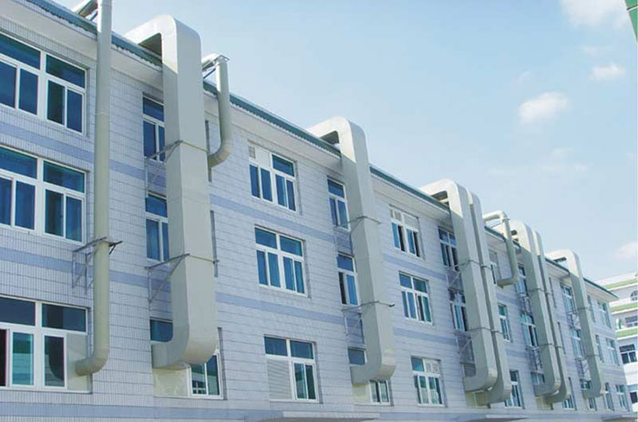 對(duì)于一般的普通建筑,若室內(nèi)排出的氣體沒有腐蝕性,通風(fēng)管道可以采用鍍鋅鋼板,對(duì)于產(chǎn)生有腐蝕性氣體的實(shí)驗(yàn)室,風(fēng)管應(yīng)采用耐腐蝕材料的PVC風(fēng)管或玻璃鋼風(fēng)管。在一般的實(shí)驗(yàn)室通風(fēng)工程,室內(nèi)大多采用PVC風(fēng)管、室外采用玻璃鋼風(fēng)管。對(duì)于室內(nèi)層高不足的實(shí)驗(yàn)室或采用大型風(fēng)管的實(shí)驗(yàn)室,一般采用矩形風(fēng)管,以便與現(xiàn)場(chǎng)空間匹配,在滿足風(fēng)管要求的前提下,盡量減小風(fēng)管占用空間。圓形風(fēng)管采用插件連接,矩形風(fēng)管采用法蘭方式連接,根據(jù)實(shí)際情況也可采用插件方式連接。
