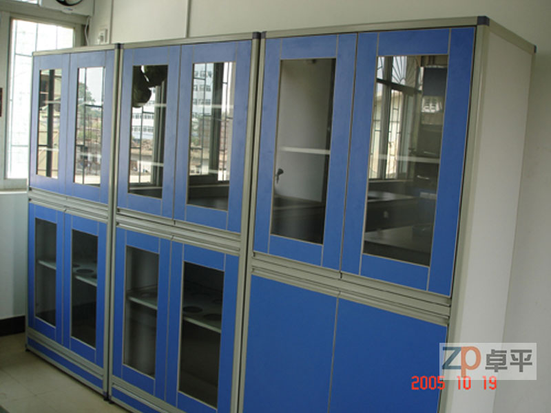 鋁木結(jié)構(gòu),門板采用18mm厚優(yōu)質(zhì)中纖板,貼一面藍一面灰色三聚氰胺板。柜體采用18mm厚三聚氰胺板;所有斷面經(jīng)優(yōu)質(zhì)2mmPVC封邊防水處理,四邊倒角圓滑處理;上雙開玻璃門,下雙開木門,木制層板,通透式設(shè)計,美觀大方。所有板件采用拆裝式三合一連接,結(jié)構(gòu)穩(wěn)固,承重性能好且易于拆遷,利于在實驗室這個特殊的工作環(huán)境使用。