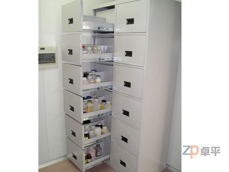 1)柜體、層板采用1.0mm厚優(yōu)質冷軋鋼板為基材機制,經(jīng)酸洗磷化處理,表面經(jīng)環(huán)氧樹脂靜電粉末噴涂;整體穩(wěn)重合理,防酸堿抗腐蝕性能極佳;
